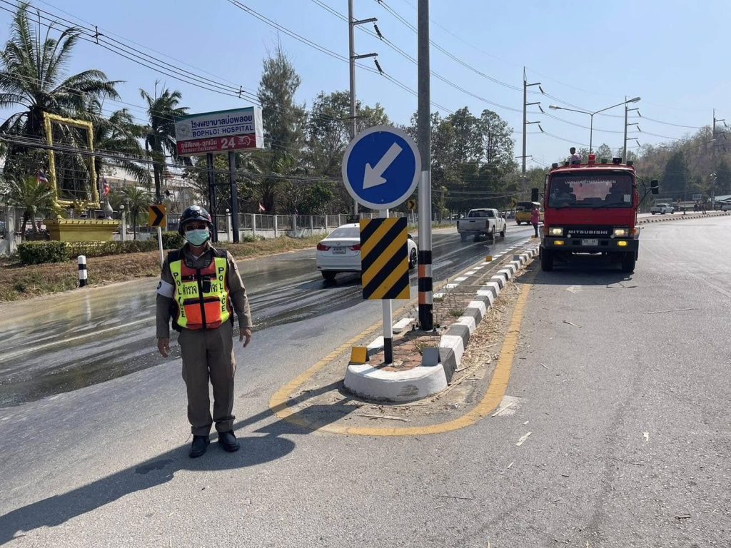 ได้อำนวยความสะดวกการจราจร รถน้ำของเทศบาล ที่มาดำเนินการล้างพื้นผิวจราจร เนื่องจากมีดินทรายตกหล่นบริเวณถนน หน้าวัดเขาวงจินดาราม