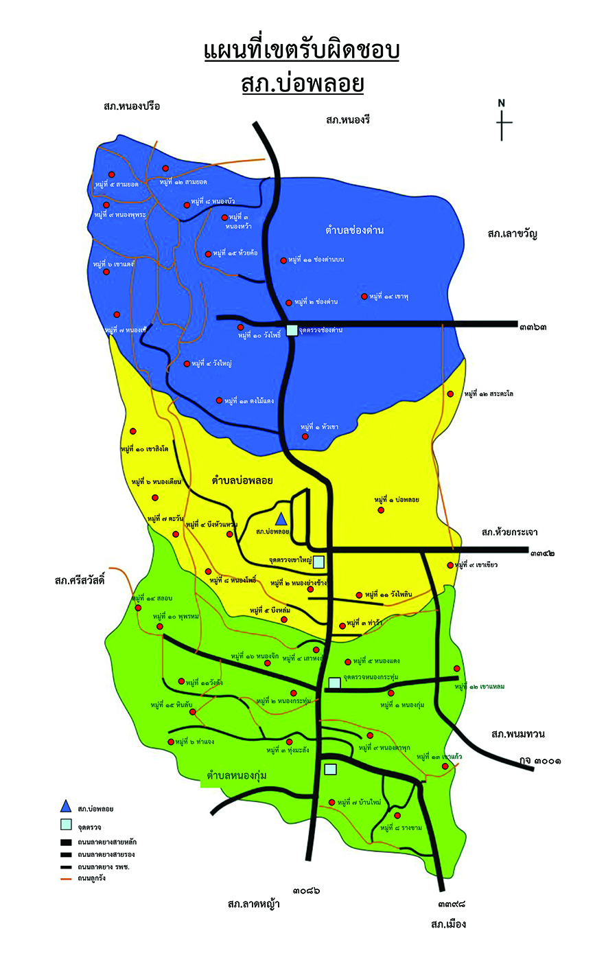 ติดกับที่ว่าการอำเภอบ่อพลอยจังหวัดกาญจนบุรี มีพื้นที่รับผิดชอบ ทั้งสิ้น 809.23 ตารางกิโลเมตร
